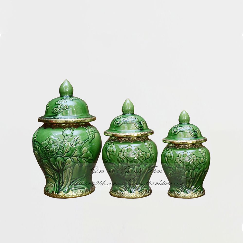 Xưởng sản xuất bộ đồ thờ men xanh ngọc lục bảo gốm sứ Bát Tràng cao cấp, chóe muối, gạo, nước bọc đồng đắp nổi hoa văn đẹp mắt, đăng cấp