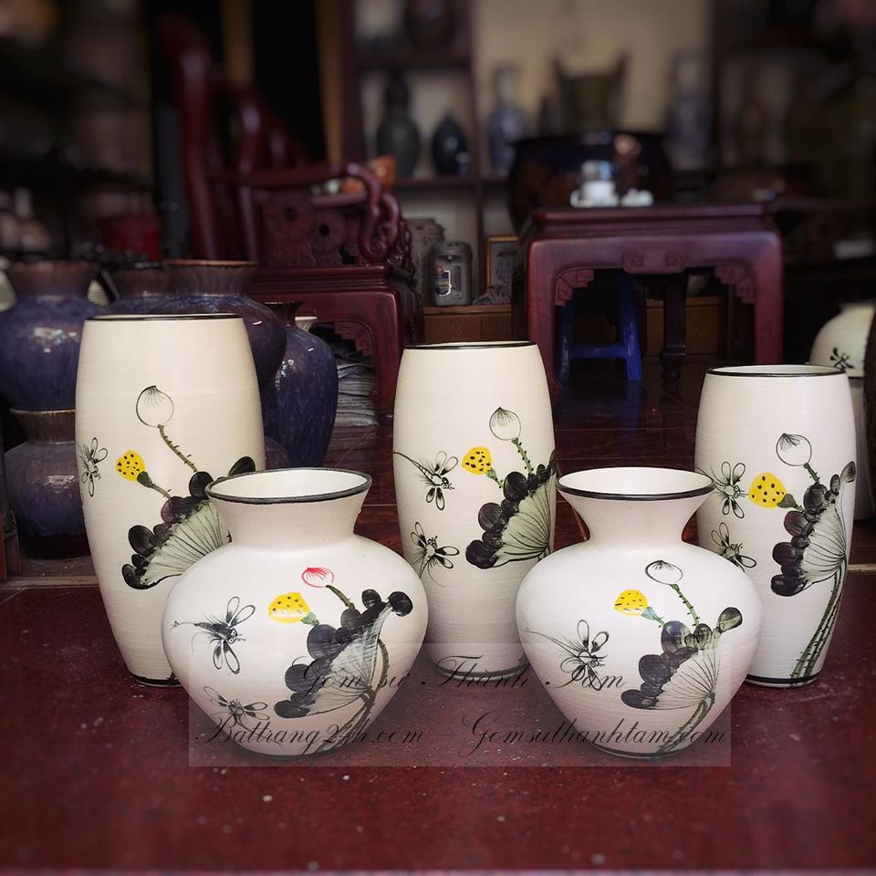 Mua lọ hoa đẹp gốm sứ Bát Tràng, lọ hoa cao cấp trang trí giá rẻ chất lượng men trắng vẽ hoa sen